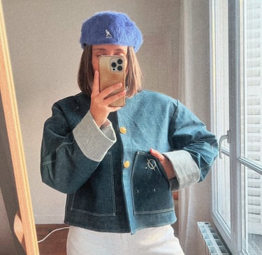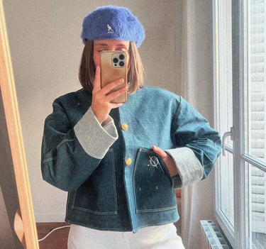 Une pièce faite à la main, née d’un blazer upcyclé et sublimée par un foulard en matière naturelle.